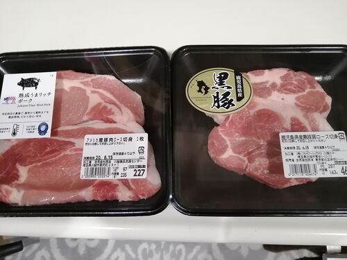 朝に西友に行って豚肉を見ると黒豚の肩ロースが残ってたので買いました 比べるのに値段が約3分の一のアメリカ産熟成うまリッチポーク ロースも買いました 見た目が全然違いますね 右が黒豚 決定的な違いは臭み 黒豚は臭み無し ウマリッチポークは臭みあり 黒…